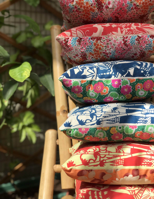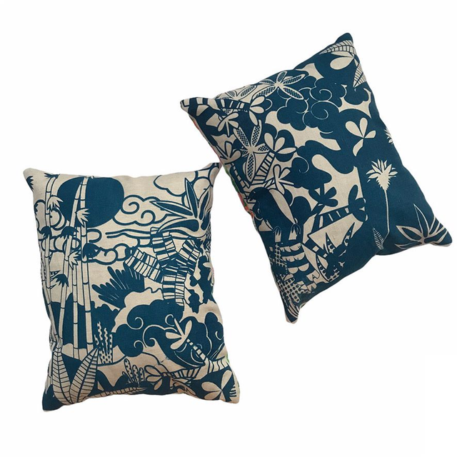 Jungle cushions are a duo of hand printed illustrations. The mysterious and lush jungle is hand printed on cotton. Backside a floral pattern cotton reasons with those illustrations. They are handmade and already filled.