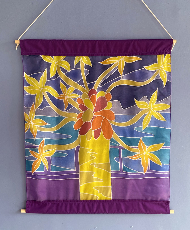 Inspired by Asian silk painting scrolls, Atelier Canopée's paintings depict an imagineray tropical nature to be hanged on wall. To be read from bottom to top, the paintings are colourful and lush. The silk is framed by solid color side bands to emphasize the design.